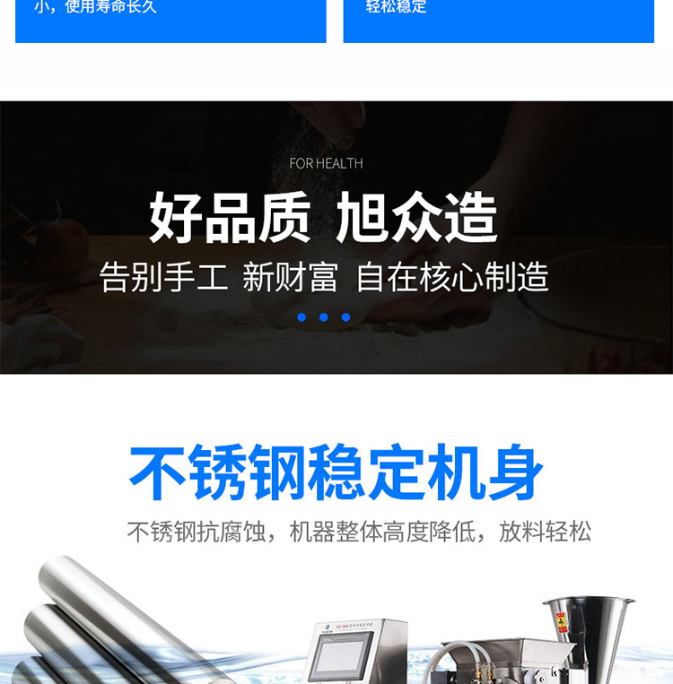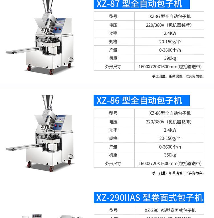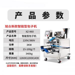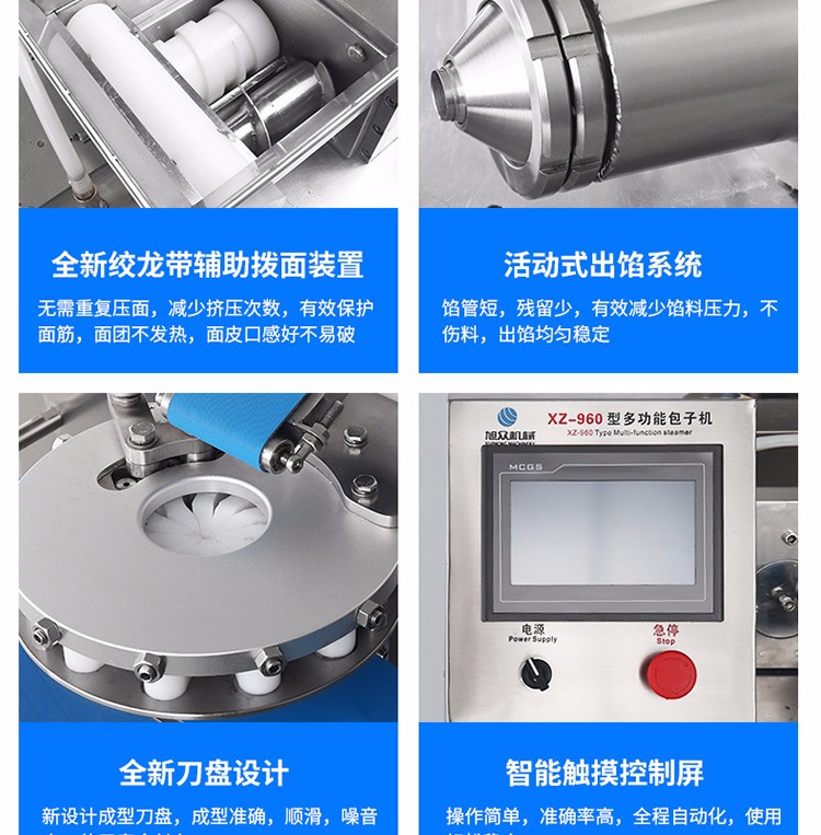 XZ-960多功能包子機(jī)采用新設(shè)計(jì)出面系統(tǒng),帶有輔助撥面裝置投面后無(wú)需重復(fù)使用手壓面/推面,有效提高工作效率/預(yù)防安全隱患;絞龍采用新概念,減少擠壓次數(shù),有效保護(hù)面筋、面團(tuán)不發(fā)熱,保證面皮的口感;做湯包時(shí),皮可更薄,面皮里外更光滑(可當(dāng)氣球吹大)有效保護(hù)餡料里面的湯汁不會(huì)漏出或被吸收;出面斗帶有自動(dòng)恒溫制冷系統(tǒng)最低溫度可達(dá)2℃ ,冷媒:R134A(特殊要求可按要求定制)(若定制,貨期增加20天工作日);操作簡(jiǎn)單易懂,拆裝簡(jiǎn)單,清洗方便;適合產(chǎn)品范圍:湯包,小龍包,速凍包,生煎包,發(fā)面包子,各類餡料包子等產(chǎn)品