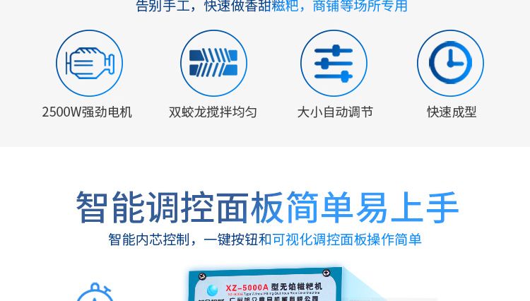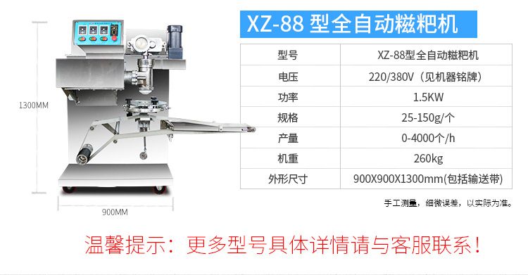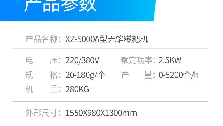 XZ-5000A型無餡糍粑機,可生產(chǎn)糯米糍粑、蛋酥糍粑、酥糖糍粑、板栗糍粑、黃豆糍粑、麥香糍粑等各種無餡糍粑制品。適用于商場、超市、酒店、影劇院、學校、圖書城、游樂園、旅游景點等各種場所。免費提供工藝技術。免費上門培訓指導安裝。