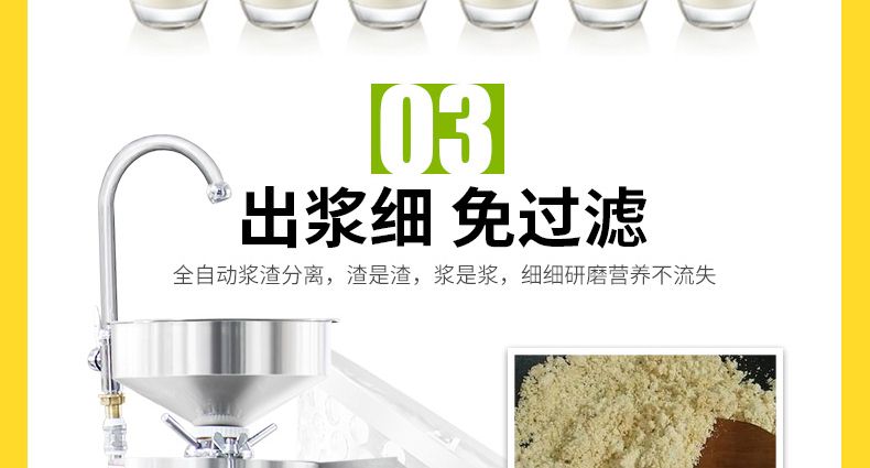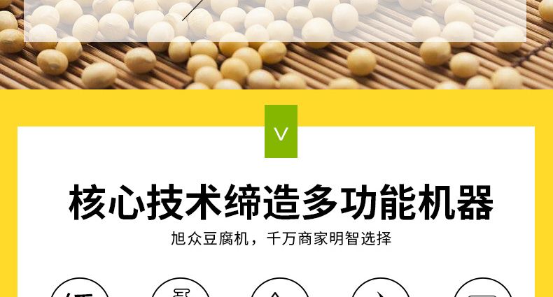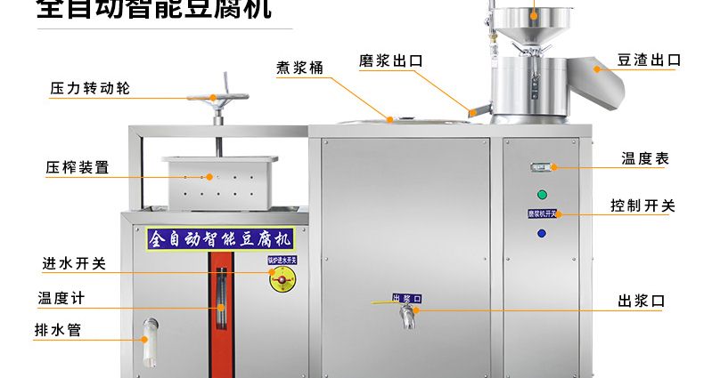 旭眾智能豆腐機(jī)專業(yè)生產(chǎn)數(shù)種豆?jié){制品,穩(wěn)定高效,采用磨漿分離機(jī)和煮漿機(jī),出品率高于其它設(shè)備,擁有自動控制系統(tǒng),還增加數(shù)碼溫度控制儀,對煮漿隨時進(jìn)行監(jiān)控,同時對不同產(chǎn)品所需溫度自行設(shè)定,當(dāng)煮漿達(dá)到設(shè)定溫度時,具有自動提示及報警功能;整機(jī)采用不銹鋼材質(zhì)制作,質(zhì)量卓越,占地面積小,安裝簡單,工藝先進(jìn),一臺設(shè)備只需一人操作,省時、省力、省工。