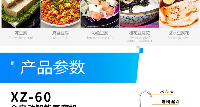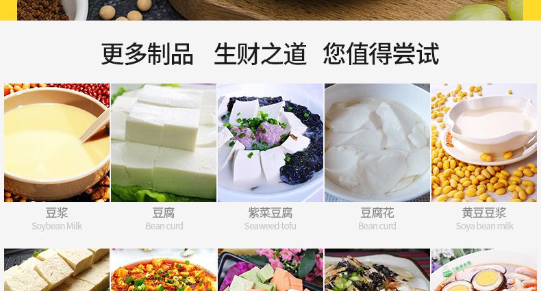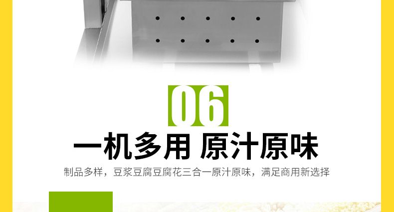 全自動豆腐機(jī)系列,一機(jī)多用:可生產(chǎn)豆腐系列產(chǎn)品:單色(嫩,老)豆腐、多彩豆 腐、單色豆腐皮、多色豆腐皮、彩色豆腐干、豆?jié){、豆花等豆制品制作,還可以與其他設(shè)備和工藝配套生 產(chǎn)更多的豆制品。