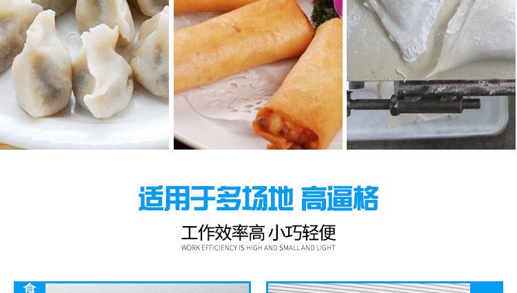 ?一機(jī)多用:只要更換模具,就可以制造不同的食品,如春卷、餛飩等,面皮厚度與餡量可調(diào)整;
