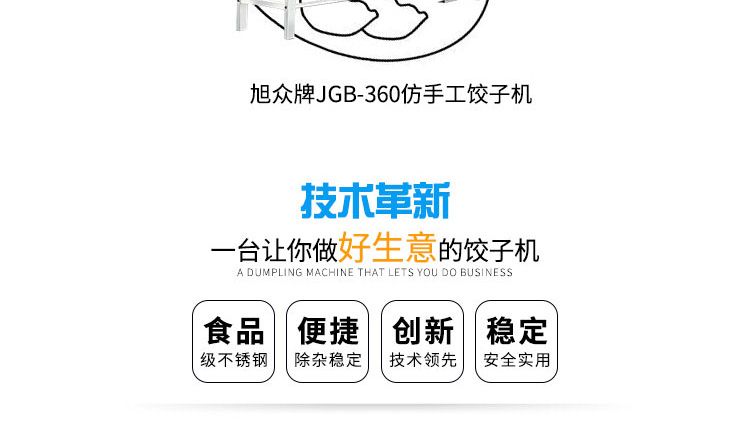 旭眾牌JGB-120-5A型輸送帶餃子機(jī)是一款可生產(chǎn)各種肉餡、肉菜混合餡、全菜餡及其它種餡餃子的設(shè)備。完美的設(shè)計(jì),兼顧衛(wèi)生與美觀兩大優(yōu)點(diǎn),并且拆裝容易,清洗簡(jiǎn)便。