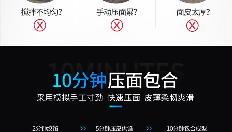 ?本機(jī)采用自動(dòng)軋制面皮后包制餃子的新工藝技術(shù),克服了舊式餃子機(jī)絞龍強(qiáng)力擠壓,使面團(tuán)面粉發(fā)熱、糊化、面制變硬、面胚失去筋度,而造成的餃子口感發(fā)硬,面皮較厚的缺陷。