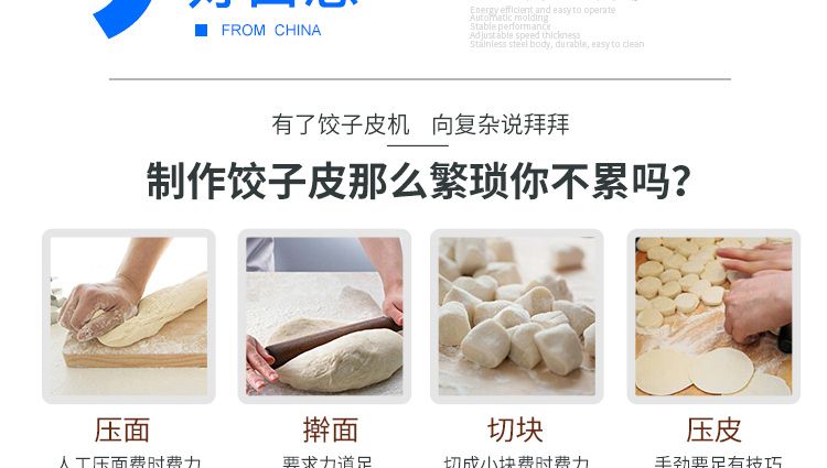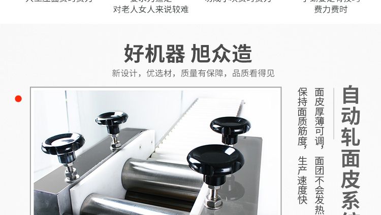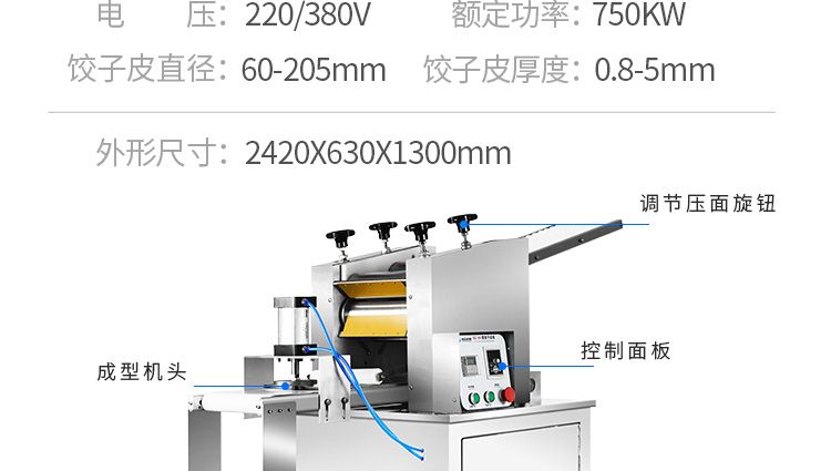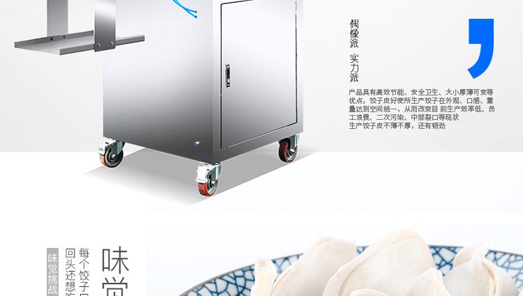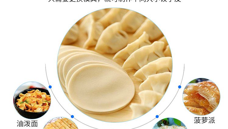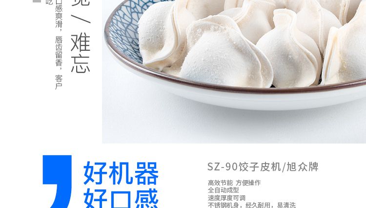 JGB-90型餃子皮機(jī)是我公司開(kāi)發(fā)生產(chǎn)的先進(jìn)餃子皮生產(chǎn)設(shè)備。可以簡(jiǎn)單更換模具(可根據(jù)客戶定制不同形狀、尺寸的模具),本設(shè)備采用氣缸運(yùn)動(dòng)。本廠生產(chǎn)的90餃子皮機(jī),采用多道壓面輥壓面,壓面效果優(yōu)異,壓出的面皮筋道,進(jìn)一步提高所包出的餃子口感。