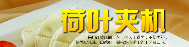 “荷葉夾”顧名思義便是其形狀似荷葉,蒸制后的成品小巧可愛(ài),擺滿盤中不禁令人聯(lián)想到成片荷葉隨風(fēng)搖擺并不時(shí)傳來(lái)陣陣荷香的美景而頓生涼意,非常適合在酷暑中作為點(diǎn)心。荷葉夾機(jī),是一種把拌好的面團(tuán)放在機(jī)器,加工制作荷葉夾的食品機(jī)械,可生產(chǎn)各種荷葉夾、蝴蝶夾、肉夾饃、也可生產(chǎn)刀切饅頭。