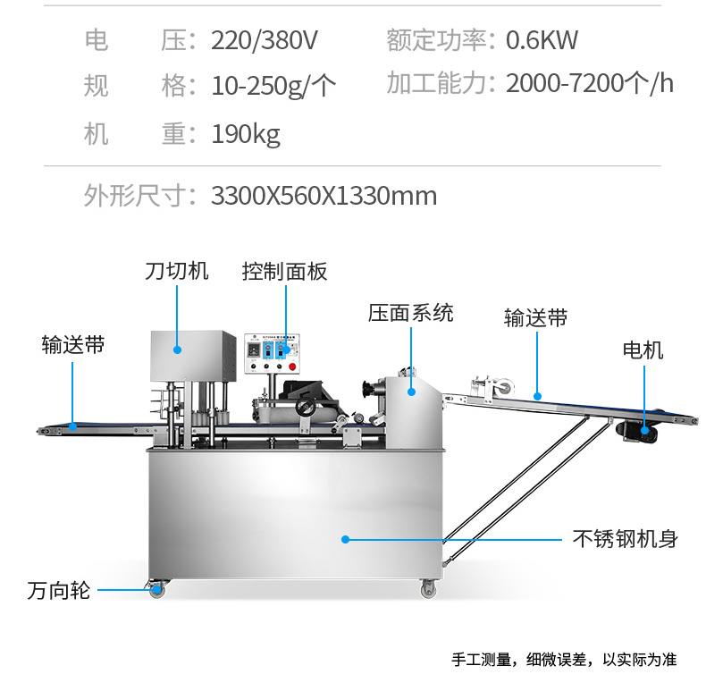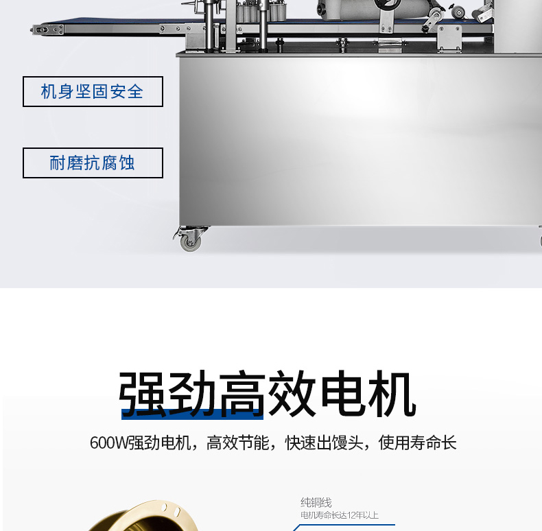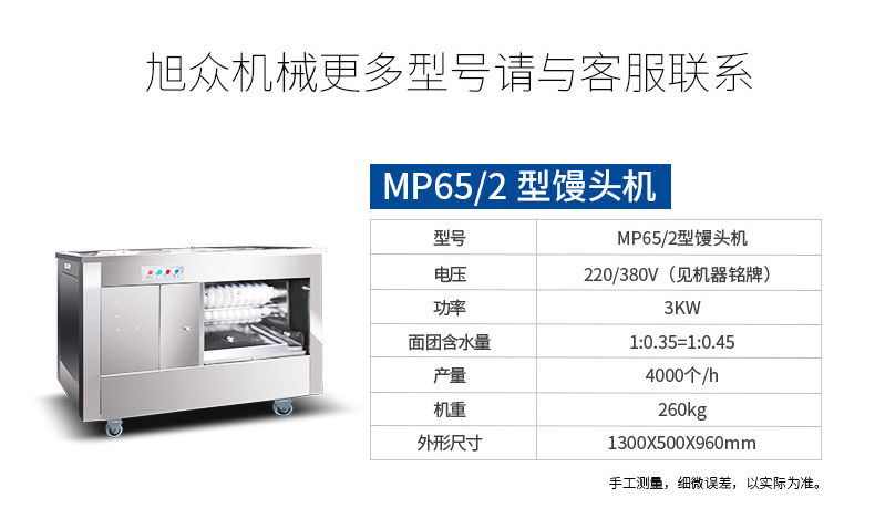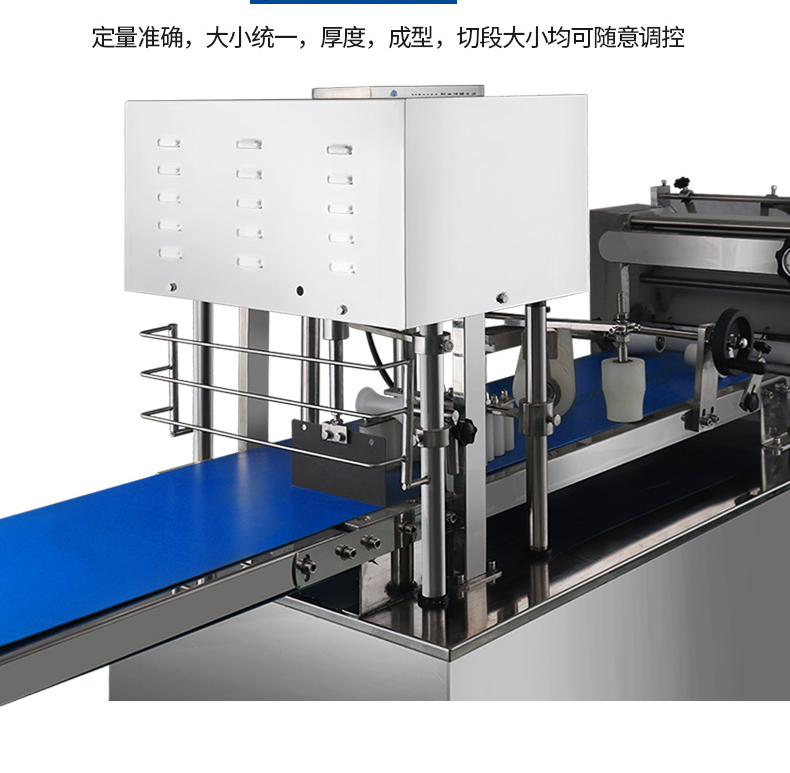 ?自動化程度高,定量準(zhǔn)確,制品大小統(tǒng)一,饅頭面帶厚度、成型、切段大小均可隨意調(diào)控;
