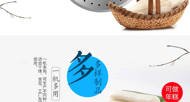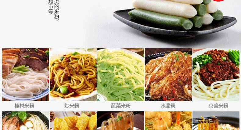 ◆ 不銹鋼米粉機(jī)生產(chǎn)多樣性可生產(chǎn)米粉、米線、粉絲、粉條、年糕、玉米面條、各種雜糧粉絲、各種面條、雜糧面條、彩色面條以及以紅薯、玉米、大豆、蠶豆等制成淀粉為原料的等多種食品而且每種食品厚薄、粗細(xì)等規(guī)格可根據(jù)需要任意調(diào)整。