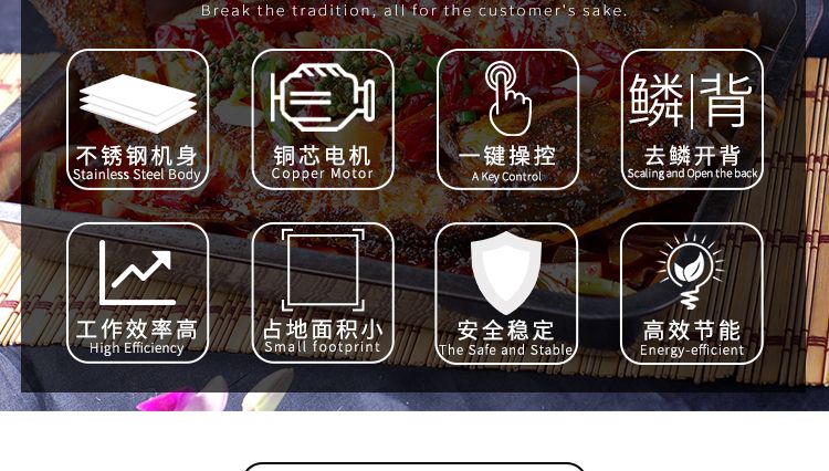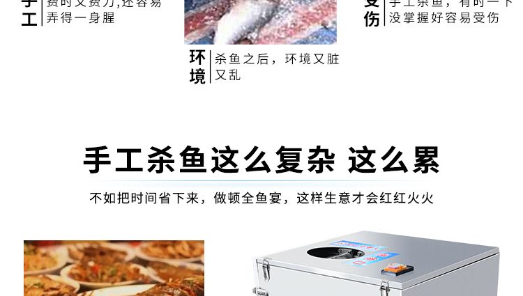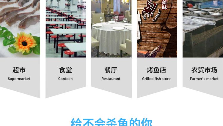本設備為魚類食品加工廠,大型超市,機關食堂,海鮮市場,農(nóng)貿(mào)市場,烤魚店,酸菜魚店,火鍋店等餐飲酒店帶來高工作效率。
