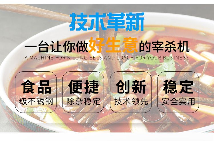 鱔魚泥鰍宰殺機是我廠根據(jù)市場需求,自行研發(fā)設(shè)計的,專業(yè)宰殺鱔魚、泥鰍的通用型機電設(shè)備,具有工作效率高,能耗低,故障率低,經(jīng)久耐用,操作安全方便,外形美觀大方等特點。填補了市面上黃鱔泥鰍宰殺設(shè)備的空白,是一款不錯的投資產(chǎn)品,可廣泛應(yīng)用于菜市場、食堂、食品加工廠、酒店等場所。