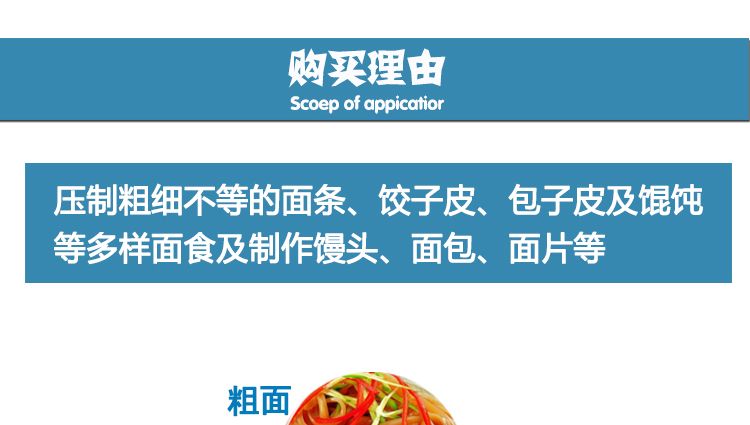 適用于賓館、面包店、糕點廠制作面包、西點、包子,可使反復(fù)壓制和面后的面團、面筋,能得到增強。