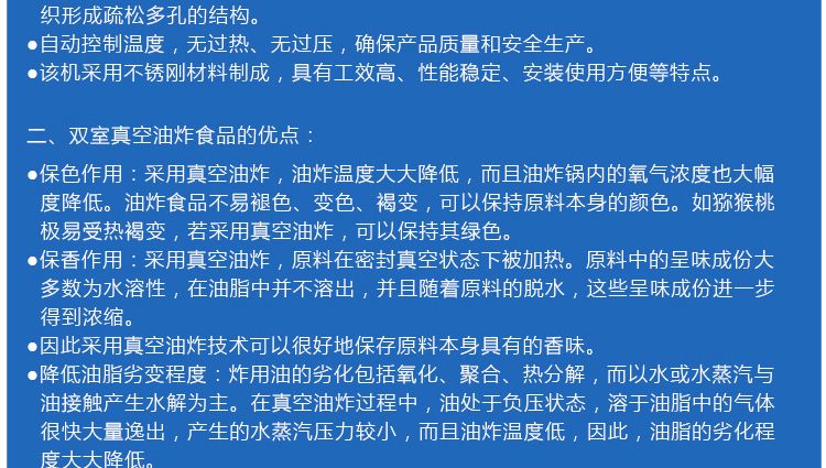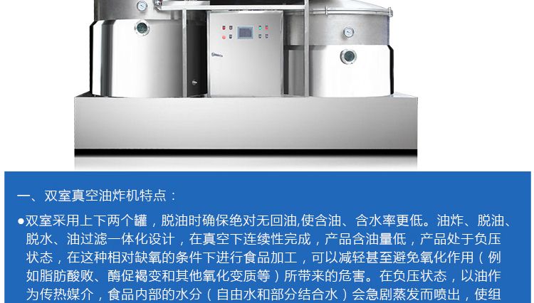 ●雙室采用上下兩個罐,脫油時確保無回油,使含油、含水率低。油炸、脫油、脫水、油過濾一體化設計,在真空下連續(xù)性完成,產(chǎn)品含油量低,產(chǎn)品處于負壓狀態(tài),在這種相對缺氧的條件下進行食品加工,可以減輕甚至避免氧化作用(例如脂肪酸敗、酶促褐變和其他氧化變質等)所帶來的危害。在負壓狀態(tài),以油作為傳熱媒介,食品內部的水分(自由水和部分結合水)會急劇蒸發(fā)而噴出,使組織形成疏松多孔的結構。