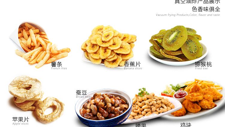 ●保色作用:采用真空油炸,油炸溫度大大降低,而且油炸鍋內的氧氣濃度也大幅度降低。油炸食品不易褪色、變色、褐變,可以保持原料本身的顏色。如獼猴桃極易受熱褐變,若采用真空油炸,可以保持其綠色。