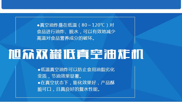 ●真空油炸是在低溫(80~120℃)對(duì)食品進(jìn)行油炸、脫水,可以有效地減少高溫對(duì)食品營(yíng)養(yǎng)成分的破壞。